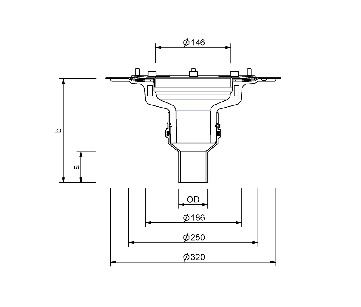 | Size DN | External diameter OD (mm) | Opening/Core borehole (mm) | a (mm) | b (mm) |