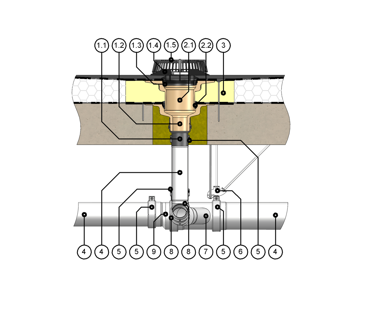SitaDSS Profi siphonic drainage rainwater outlet without Airstop, made of polyurethane, thermally insulated, to DIN EN 1253-2, in sizes DN 56 of DN 70, for direct connection to the PE pipes (butt welding or with electrofusion socket), or to the SitaPipe Edelstahl pipe system, for siphonic drainage, with pre-drilled holes to secure the component in the substructure, with foamed-in insert ring for the supplied screws, loose aluminium flange and two sealing sleeves for clamping bitumen, plastic or EPDM roofing membranes. Only in combination with the SitaDSS Profi retaining element, supply and install to professional standards.