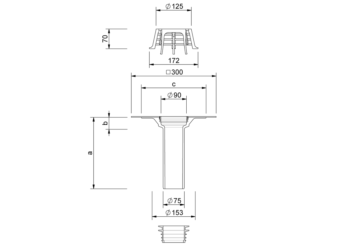 | Diamètre nominal DN | Diamètre extérieur DE (mm) | a (mm) | b (mm) | c (mm) | Sécurité d'accumulation pour la rénovation de diamètres intérieurs de/à (mm) avec bague d’étanchéité à lèvres | Sécurité d'accumulation pour la rénovation de diamètres intérieurs de/à (mm) avec bague d’étanchéité profilée |