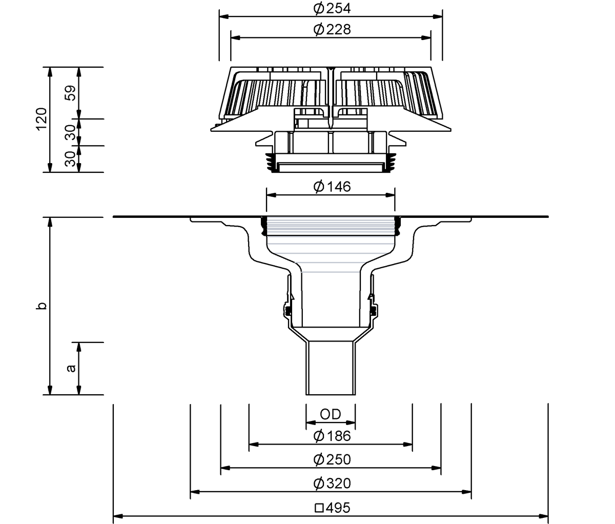 SitaDSS Profi Avaloir à évacuation dépressionnaire, en polyuréthane, calorifuge, selon NBN EN 1253-2, avec dispositif Airstop, diamètre nominal DN 56 ou DN 70, pour le raccordement direct de tuyaux PE (soudage bord à bord ou avec manchon électrosoudable) ou du système de conduites SitaPipe Acier inoxydable, pour l’évacuation dépressionnaire, avec grand manchon de raccordement adapté (495 x 495 mm) et bague de fixation pour un meilleur maintien du manchon de raccordement et pour la réception du dispositif Airstop avec arrêt de gravier. Fourniture et pose selon les règles de l’art.