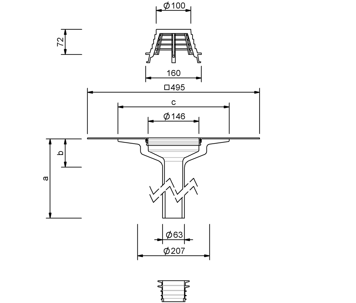 | Nominale diameter DN | Buitendiameter OD (mm) | a (mm) | b (mm) | c (mm) | Tegen terugstuwing beveiligde renovatie van afvoersystemen met binnendiameter xx tot xx (mm) met lipdichtingsring | Tegen terugstuwing beveiligde renovatie van afvoersystemen met binnendiameter xx tot xx (mm) met profieldichtingsring |
