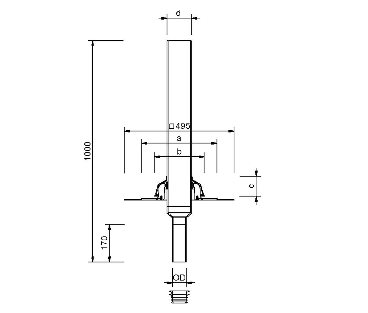 | Średnica nominalna DN | Średnica zewnętrzna OD (mm) | Przejście / otwór roboczy (mm) | a (mm) | b (mm) | c (mm) | d (mm) | Zabezpieczenie przed zatorami w przypadku średnic wewnętrznych przeznaczonych do renowacji od–do (mm) z wargowym pierścieniem uszczelniającym |