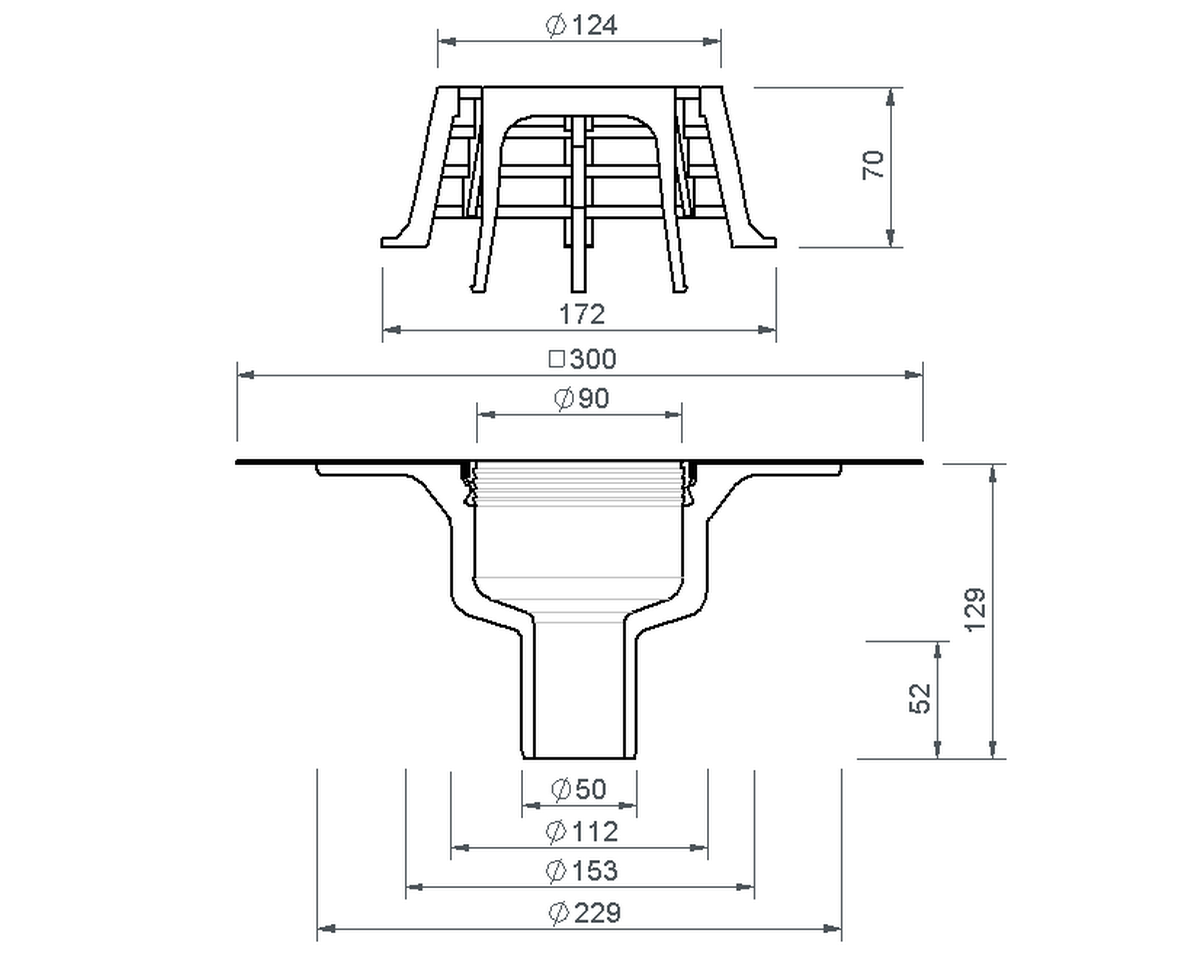 SitaCompact Balkongully, senkrecht, aus Polyurethan, wärmegedämmt, nach DIN EN 1253-2, in der Nennweite DN 50. Zum direkten Anschluss an Rohre mit Steckmuffe, zur Freispiegelentwässerung, mit eingeschäumter Wunschanschlussmanschette (300 mm x 300 mm) passend zur Dachabdichtung, mit Fixierring zur zusätzlichen Sicherung der Anschlussmanschette und zur Aufnahme des Kiesfanges. Komplett inklusive Kiesfang, liefern und fachgerecht einbauen.