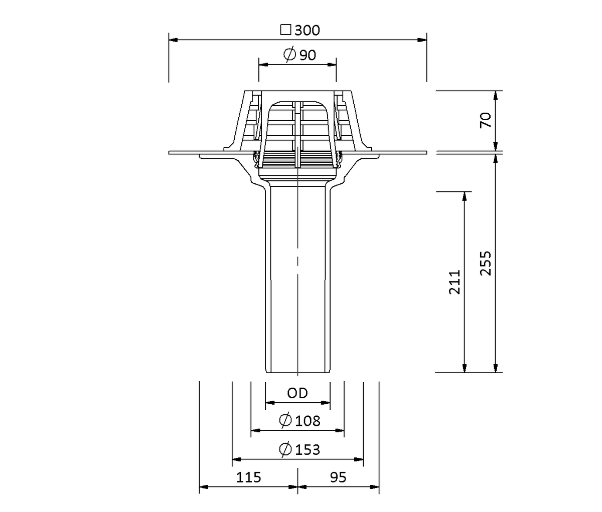 SitaCompact Near, senkrecht, aus Polyurethan, wärmegedämmt, nach DIN EN 1253-2, speziell zur Linienentwässerung von übereinanderliegenden Dachflächen, mit eingekürztem Kragen, in der Nennweite DN 70. Zum direkten Anschluss an Rohre mit Steckmuffe zur Freispiegelentwässerung, mit eingeschäumter Kunststoff-Wunschanschlussmanschette (300 mm x 300 mm) passend zur Dachabdichtung, mit Fixierring zur zusätzlichen Sicherung der Anschlussmanschette und zur Aufnahme des Kiesfanges, liefern und fachgerecht einbauen.