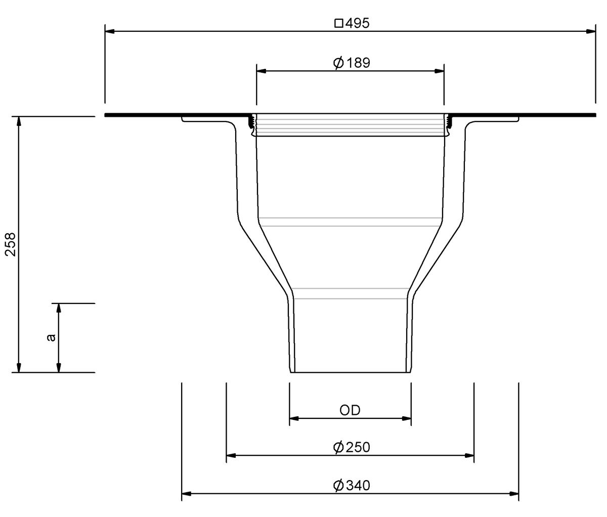 | Nennweite DN | Außendurchmesser OD (mm) | Durchbruch / Kernbohrung (mm) | a (mm) |