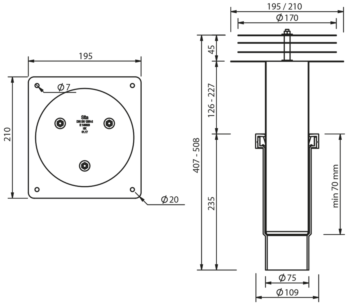SitaDSS Ravana Plus Rinnengully für die Druckströmungsentwässerung für Flüssigkunststoffabdichtungen aus Edelstahl, Werkstoff-Nr. 1.4301, nach DIN EN 1253-2, in der Nennweite DN/OD 70/75, mit einem Übergang bestehend aus einer Steckmuffe DN 70 und einer Dichtung aus EPDM, geeignet für Elektroschweißmuffen, zum direkten Anschluss an PE-Rohre nach DIN EN 1519. Mit einer Abflussmenge nach DIN EN 1253-2:2015-03 von 29,8 l/s bei einer Stauhöhe von 70 mm und Vollfüllung, mit vorgefertigten Bohrungen zur Befestigung des Bauteils in der Unterkonstruktion, mit drei Gewindestiften M6 x 55, sowie Unterlegscheiben und Sechskantmuttern, zur Aufnahme des Airstop, komplett inklusive Airstop, liefern und fachgerecht einbauen.