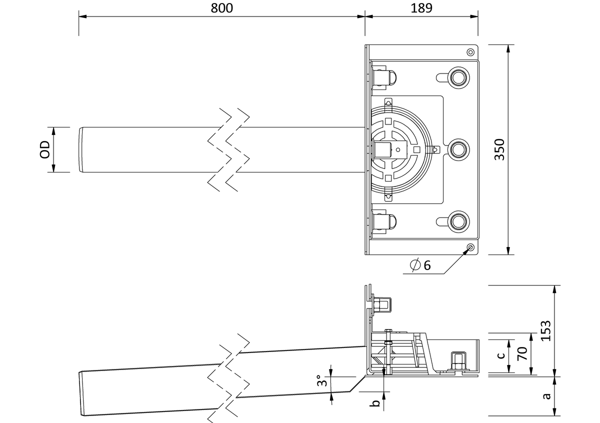 | Nennweite DN | Außendurchmesser OD (mm) | Durchbruch / Kernbohrung (mm) | a (mm) | b (mm) | c (mm) |