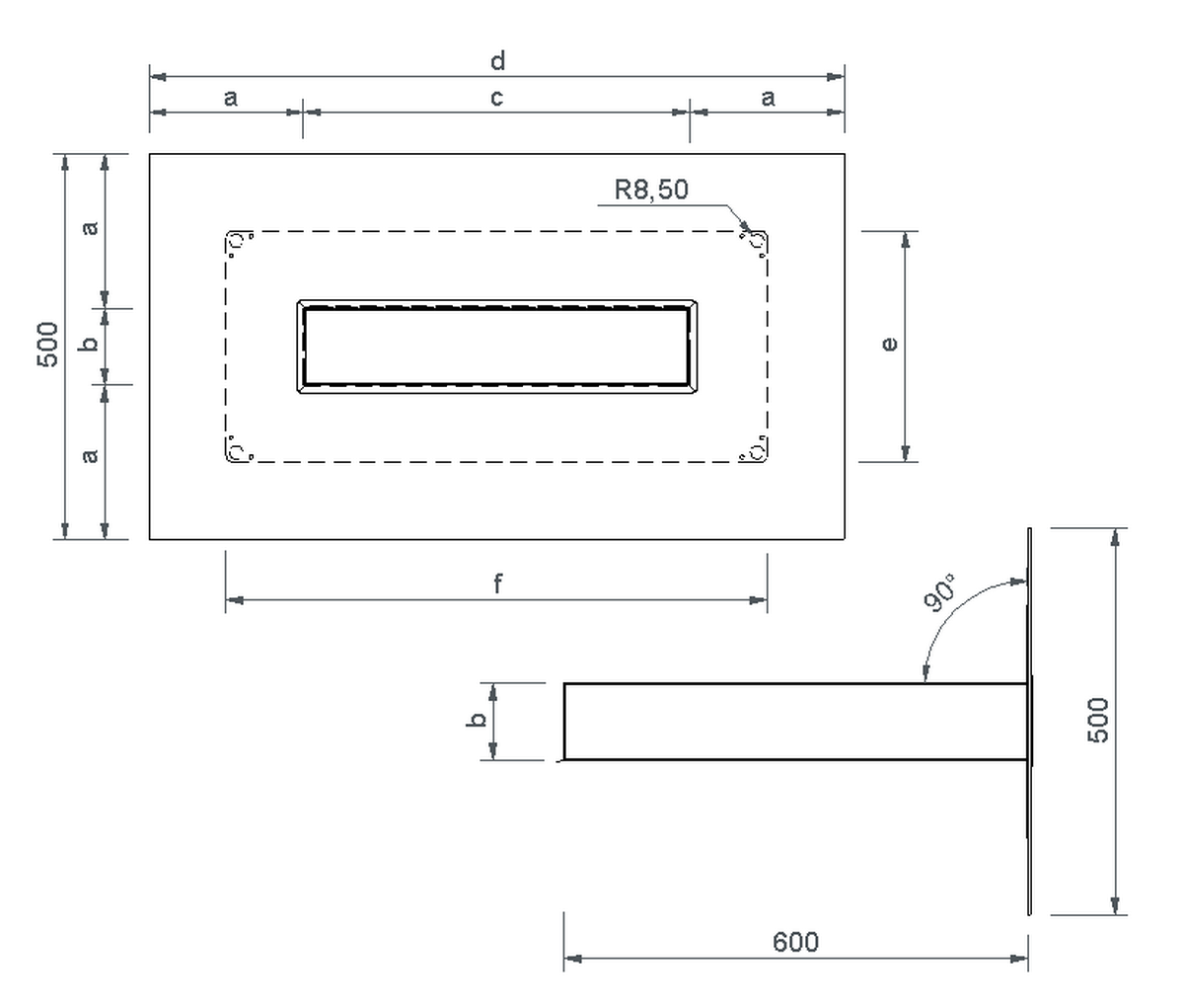 | Stutzenquerschnitt (mm x mm) | a (mm) | b (mm) | c (mm) | d (mm) | e (mm) |