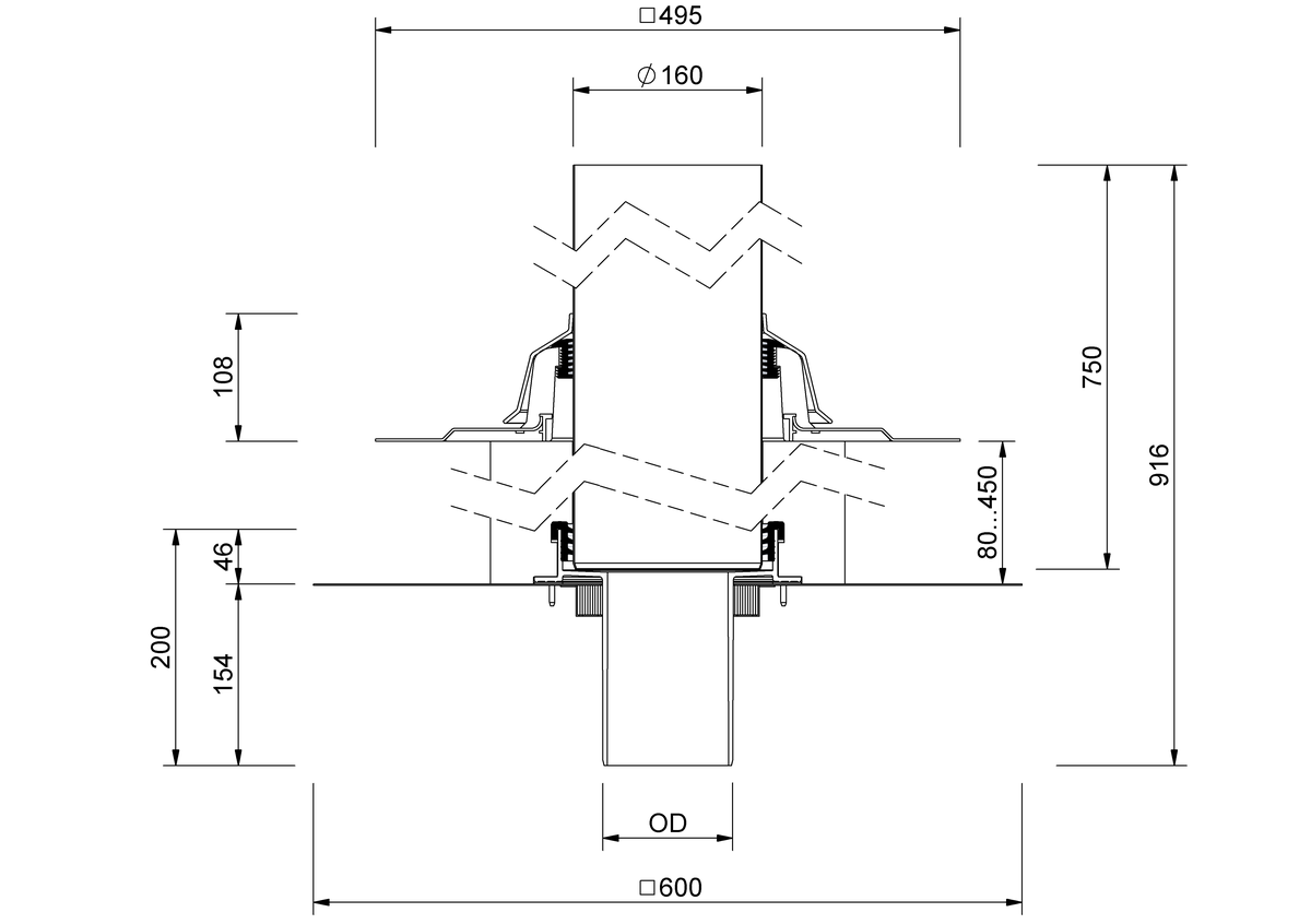 | Nennweite DN | Außendurchmesser OD (mm) | Durchbruch / Kernbohrung (mm) | Aussparungsmaß (mm x mm) | Überbrückung der Wärmedämmung min. (mm) | Überbrückung der Wärmedämmung max. (mm) |