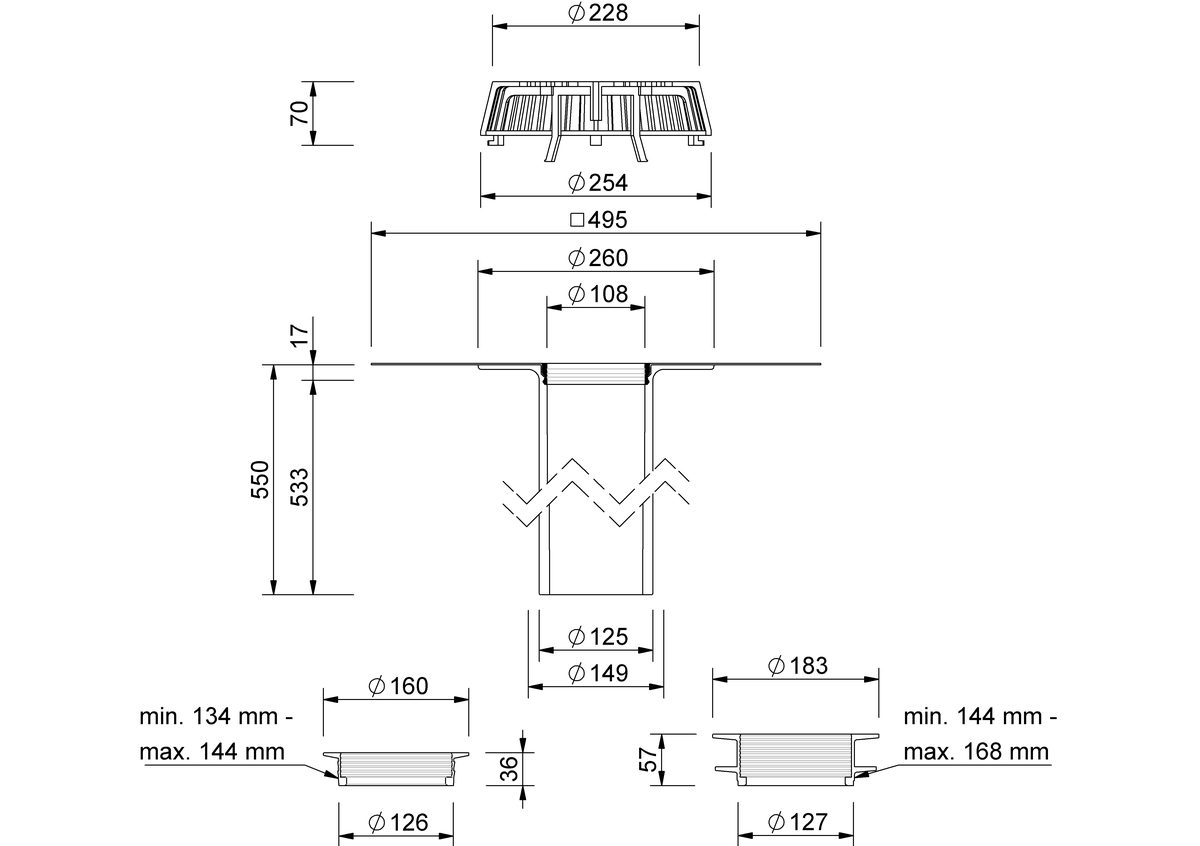Ремонтная воронка с длинным соединительным патрубком и уплотнительным кольцом. Она перекрывает существующий пирог кровли вплоть до водосточной трубы. Тем самым обеспечивается абсолютная герметичность при переходе на существующие кровельные воронки с надставным элементом или без него. Совместимые почти со всеми кровельными воронками различных производителей, воронки этой серии решают практически любую задачу в ремонте. Взависимости от внутреннего диаметра, применяется соответствующая уплотнительная манжета. Прочно вваренный и дополнительно зафиксированный заказной соединительный фартук обеспечивает однородное соединение с гидроизоляцией кровли.